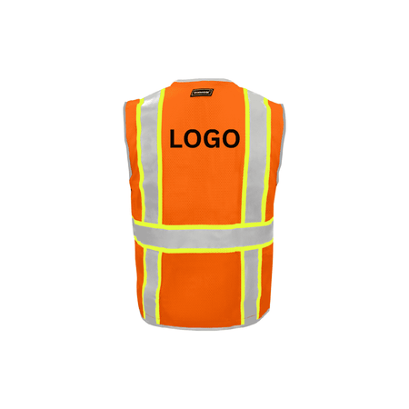 This high-visibility safety vest is designed to provide maximum visibility and practical storage for professionals in demanding environments. Constructed from 100% polyester mesh fabric in hi-vis orange, it offers superior breathability and durability. The vest features 2-inch silver reflective tape over 3-inch hi-vis lime mesh fabric, arranged to extend over the shoulders, around the torso, and in an H-pattern across the back for enhanced safety in low-light conditions.