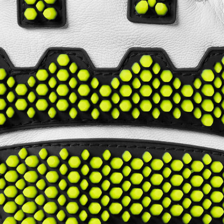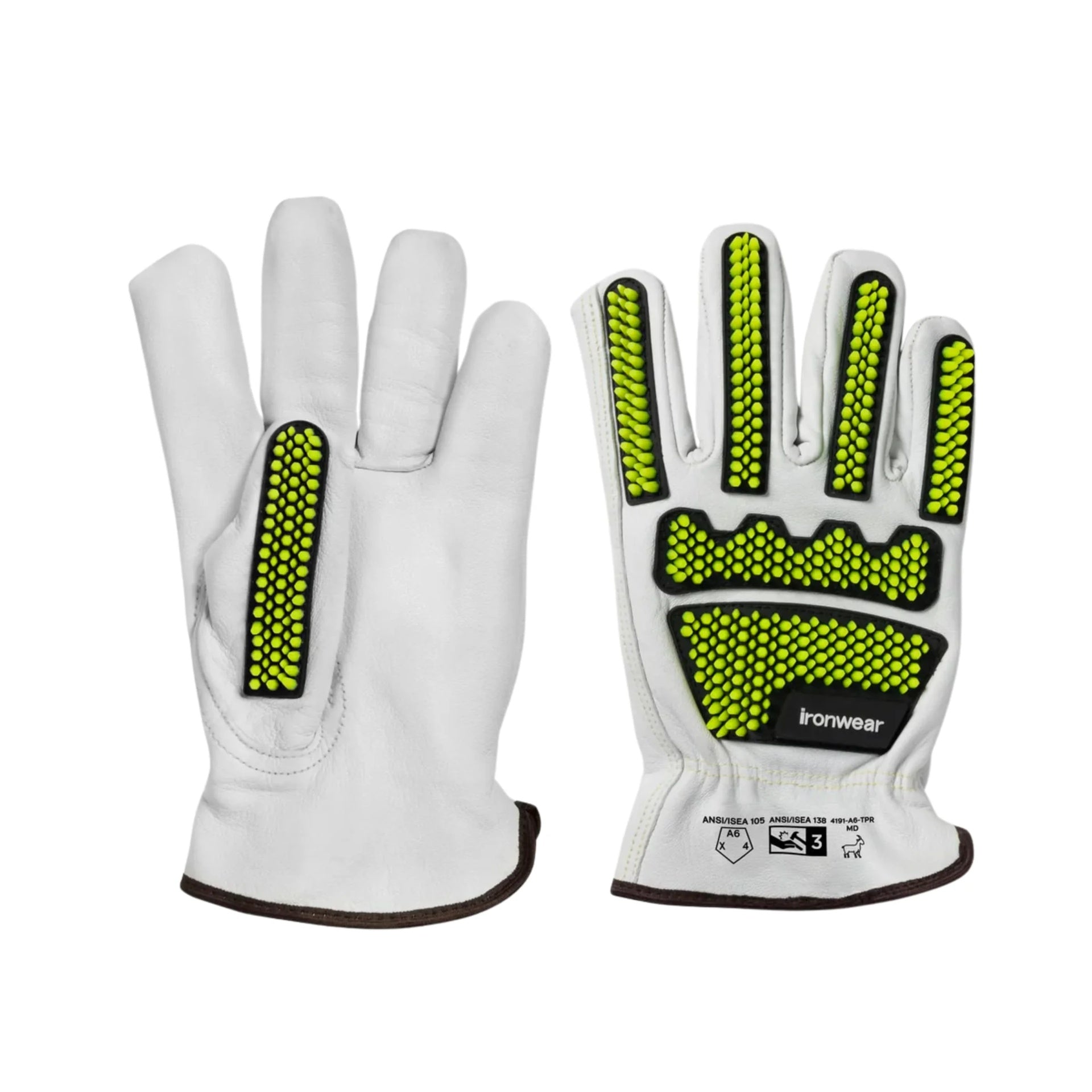 The Ironwear Style #4191-A6-TPR is a premium white driver glove constructed with a goat grain leather liner. This high-performance glove features thermoplastic rubber (TPR) on the fingers, knuckles, and back-of-hand to ensure superior protection in high-impact environments. Designed for both safety and comfort, it includes a keystone thumb for improved flexibility, making it ideal for tasks such as driving, moving, and general industrial use.