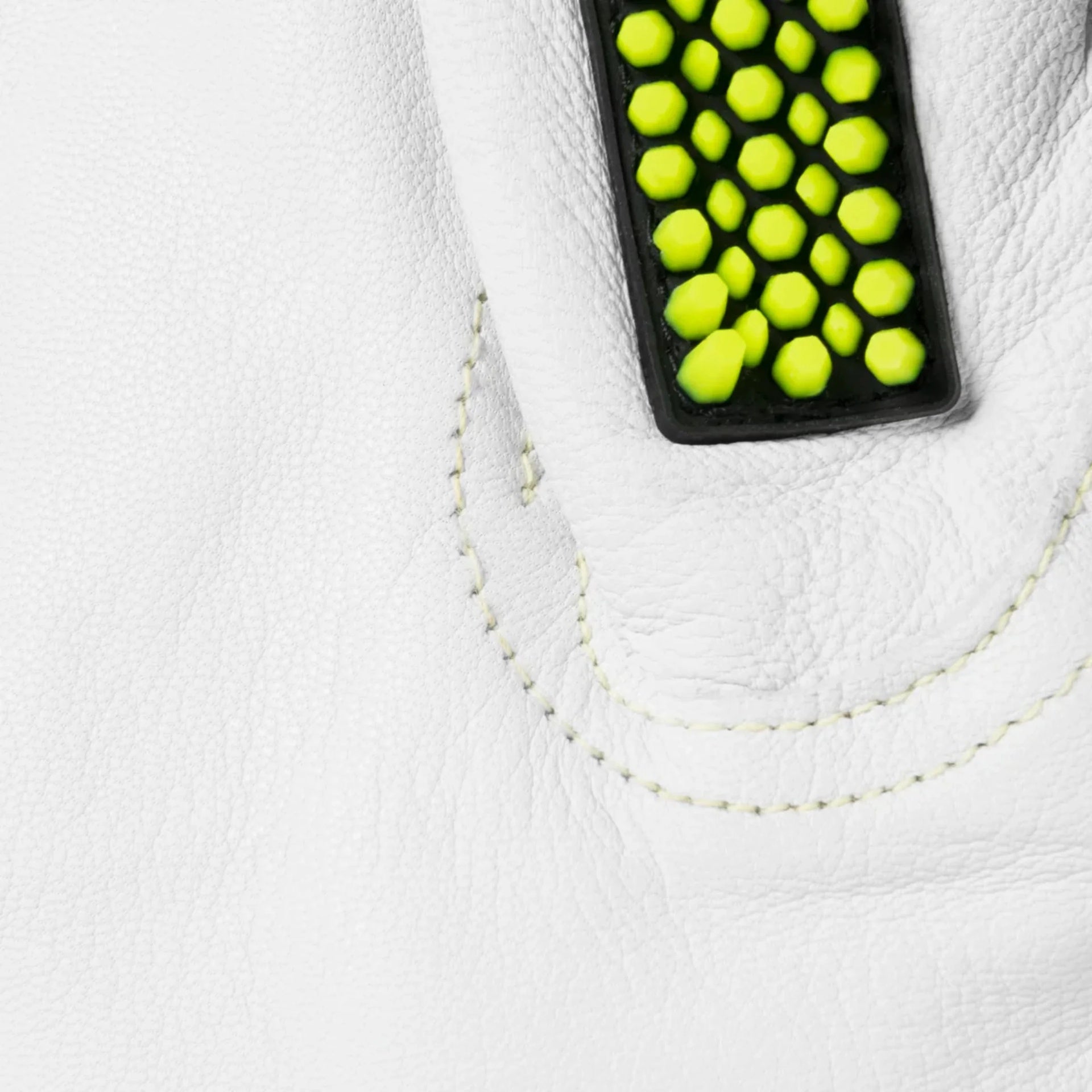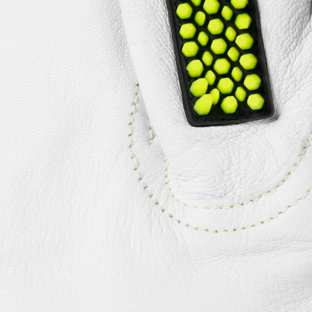 Crafted from high-quality goat grain leather, these driver gloves provide a robust yet comfortable fit for various applications. The inclusion of a keystone thumb enhances the user's range of motion and overall dexterity while performing precise tasks. The white leather finish combined with protective TPR elements offers a professional look and feel.