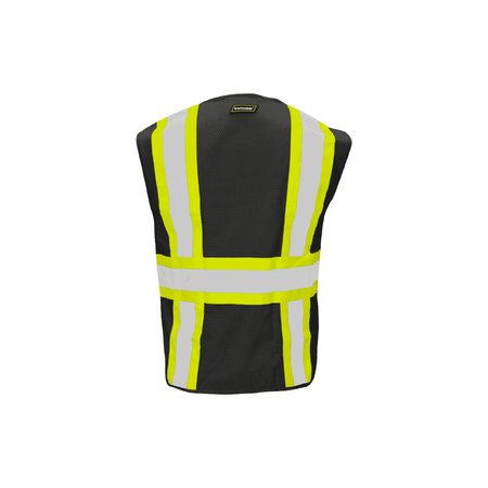 Elevate your safety and functionality with our premium two-tone safety vest, expertly crafted from 100% polyester mesh fabric. The vest features a sleek black mesh base with matching binding, accentuated by a dynamic design of 2" silver reflective tape applied over 4" lime fabric. This high-visibility accent not only enhances your safety by extending over the shoulders, around the torso, and in a distinctive H-pattern across the back but also adds a modern, stylish edge.