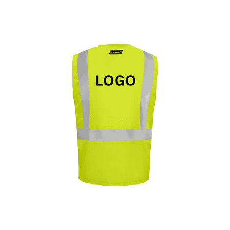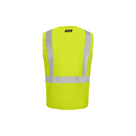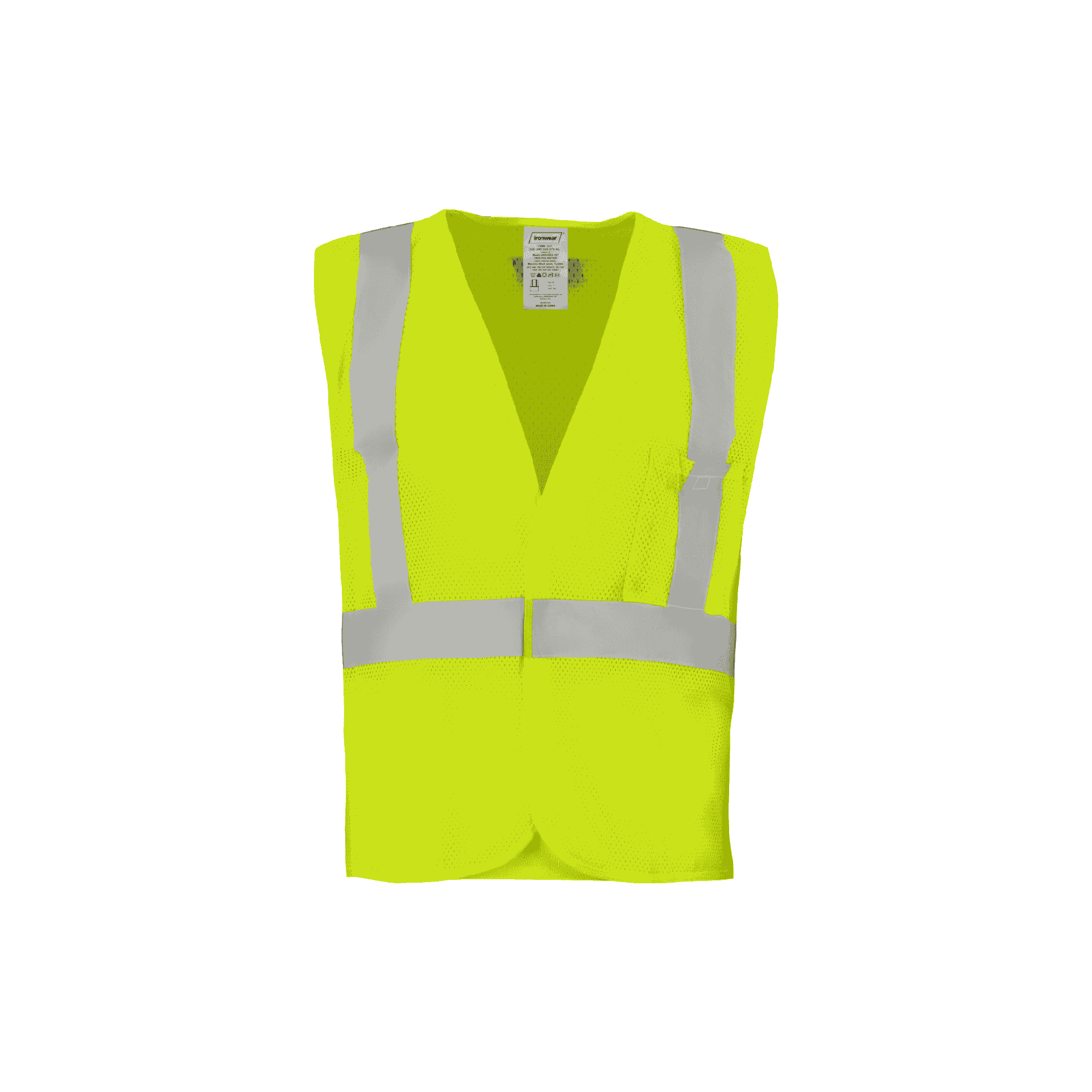 This high-visibility safety vest is made from 100% polyester mesh fabric with lime polyester binding, ensuring lightweight breathability and durability. Meeting ANSI/ISEA 107-2015 Class 2 standards, it features 2-inch silver reflective tape for enhanced visibility in low-light conditions. The hook & loop front and side closure provides an adjustable, secure fit. Designed for convenience, it includes three pockets—one outside upper chest pocket, one outside lower pocket, and one inside upper chest pocket—for essential storage. With a one-size-fits-all design, this vest is ideal for various work environments requiring increased visibility and functionality.