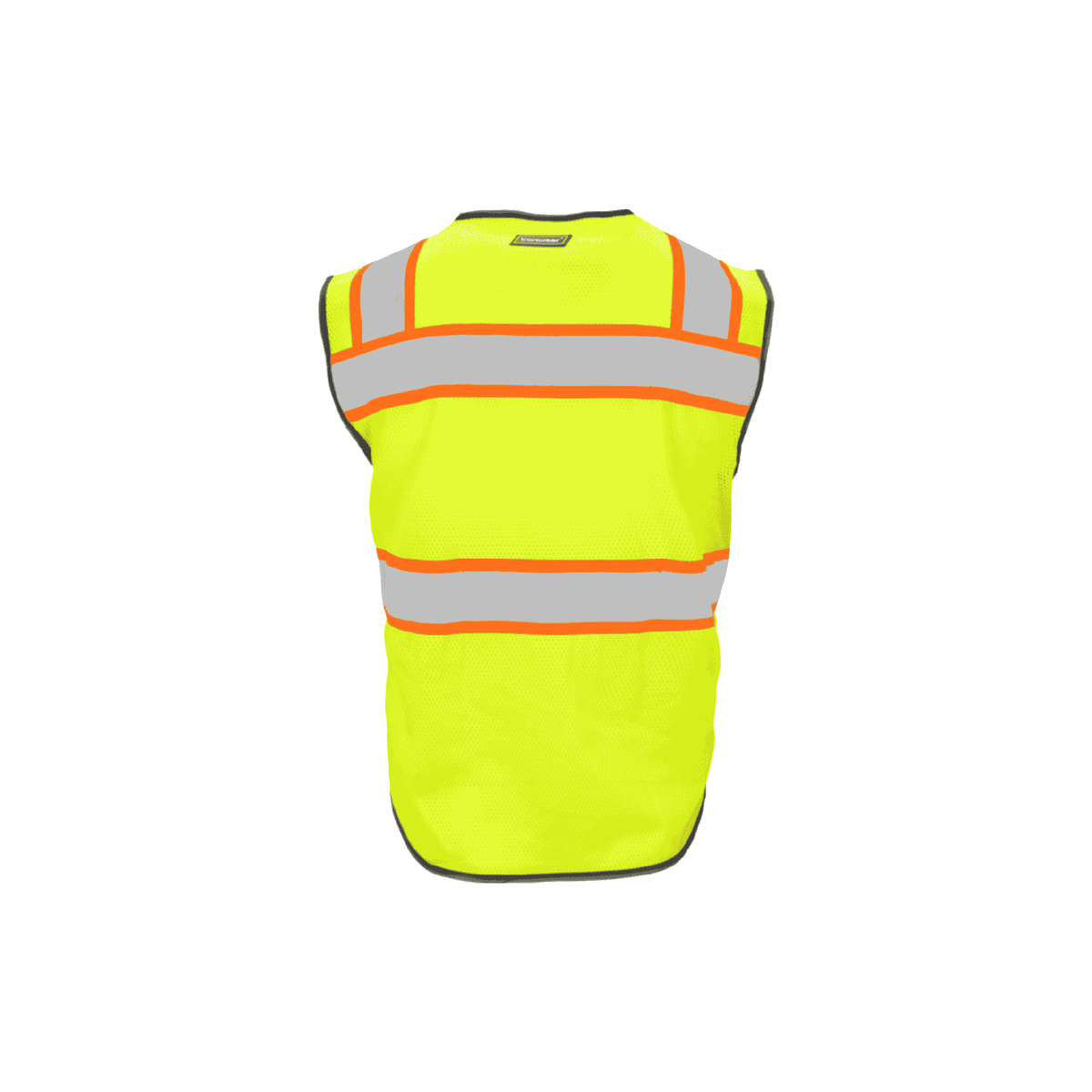 This high-visibility safety vest is made from lime polyester mesh with a black bottom fabric and binding for added durability and a clean appearance. It features 2” silver reflective tape over contrasting orange fabric for enhanced visibility. The zipper front closure ensures a secure fit, while two radio clip holders provide added convenience. Designed with eight functional pockets, including multiple chest and lower front pockets for storage, this Class 2 vest meets ANSI/ISEA 107 safety standards, making it an excellent choice for work environments requiring high visibility.