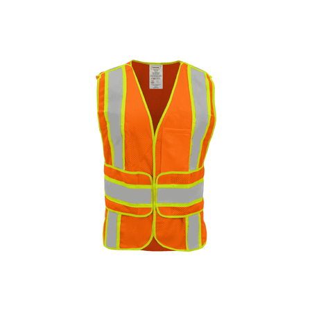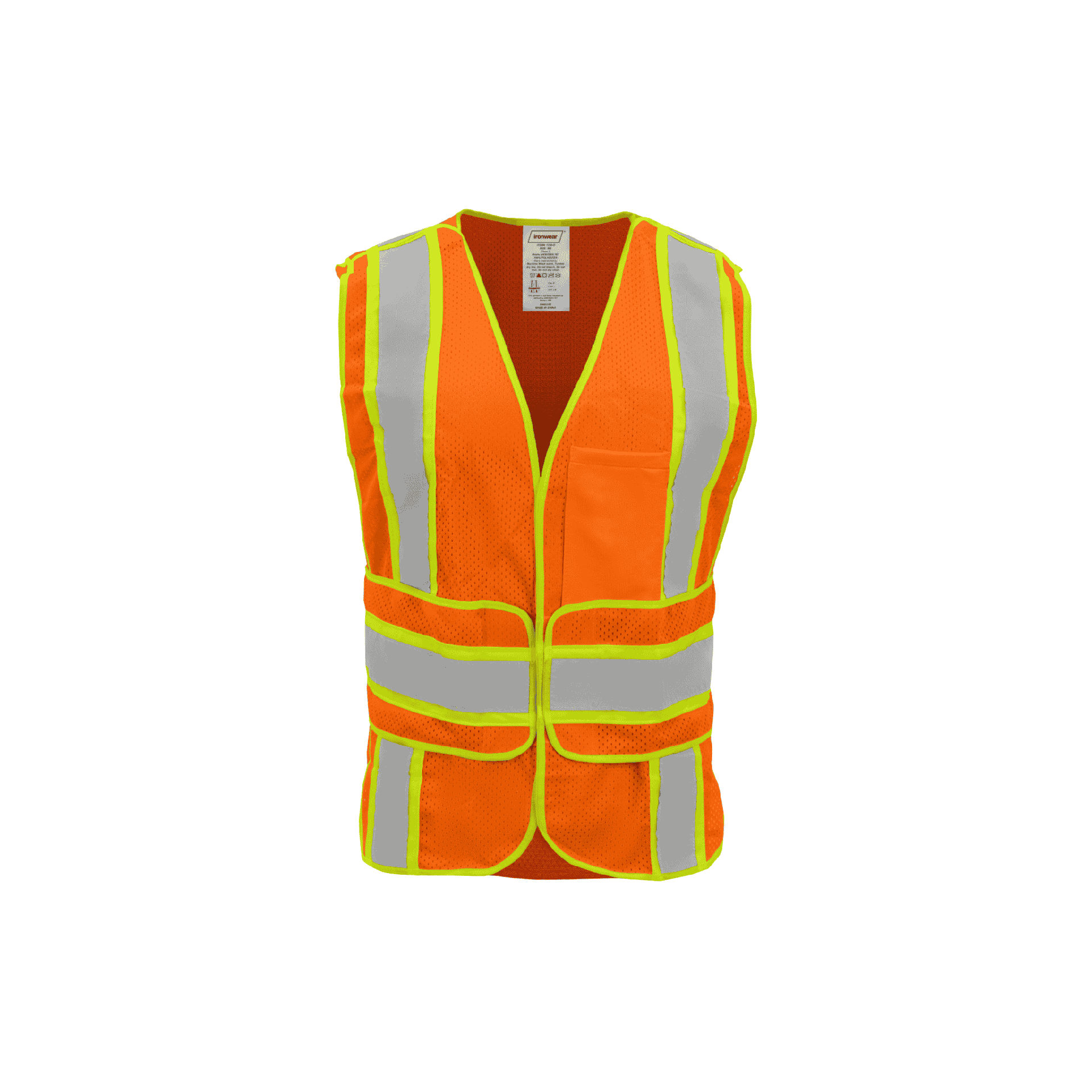 This high-visibility safety vest is constructed from 100% polyester mesh fabric with hi-vis orange polyester binding, providing durability and breathability. It meets ANSI/ISEA 107 Class 2 standards and features 2” silver reflective tape over 3” hi-vis lime fabric, ensuring enhanced visibility. Designed with a 5-point breakaway system and an adjustable hook & loop wraparound front closure, it prioritizes safety and ease of use. The chevron pattern on the back increases visibility, while four pockets—one left chest pocket and three pen pockets—offer practical storage for workplace essentials.