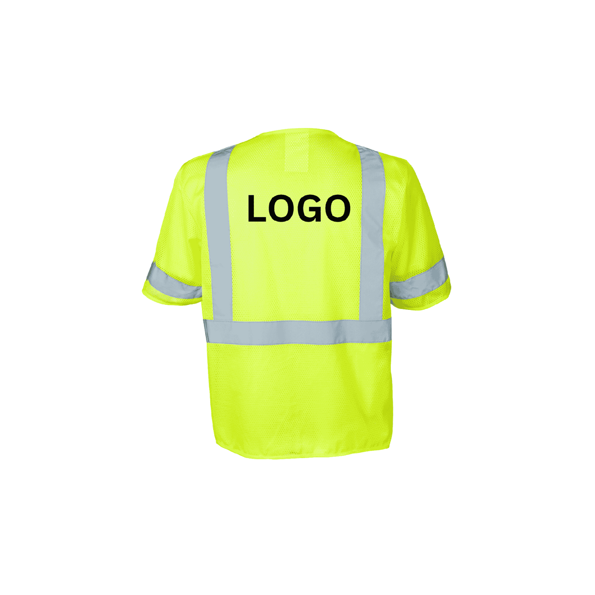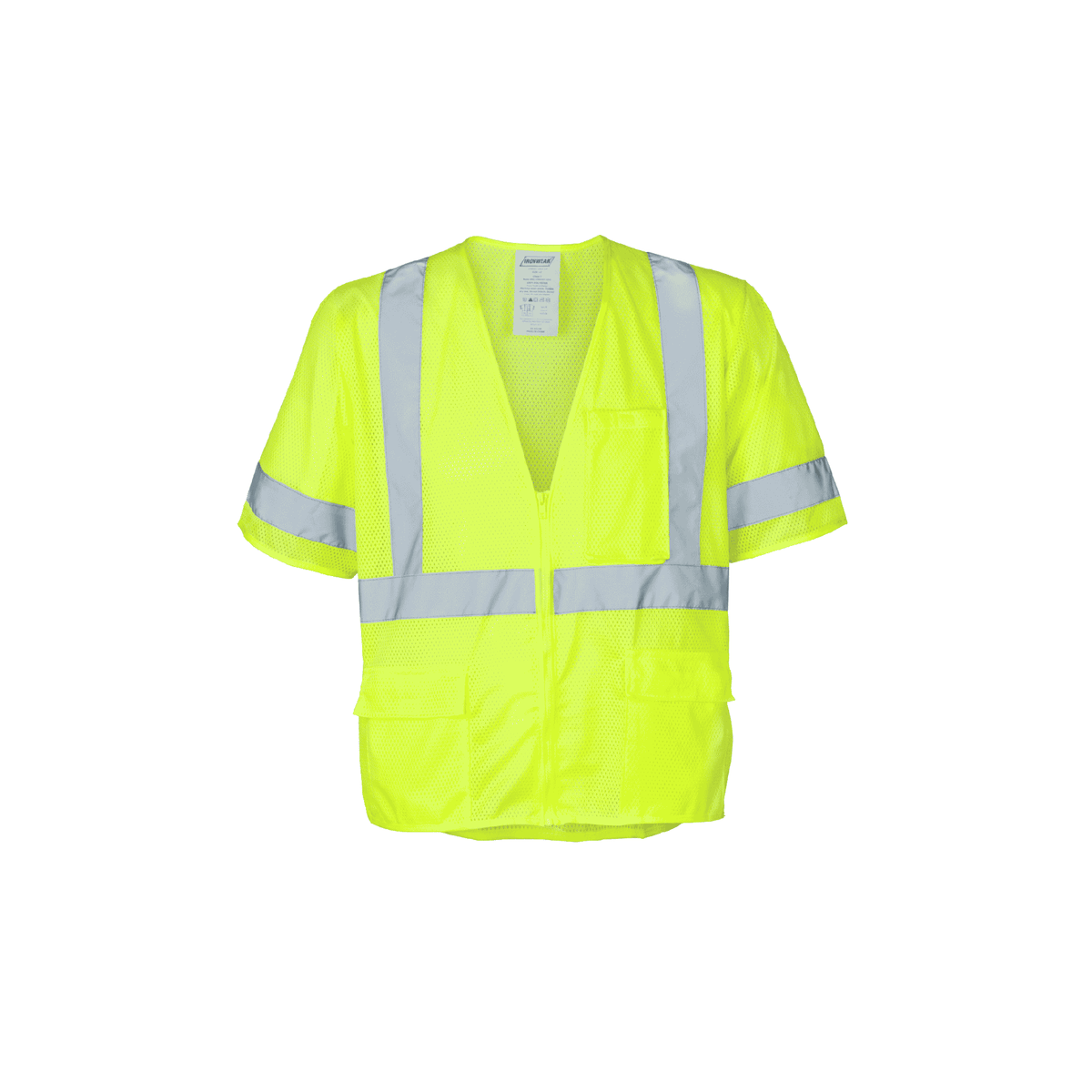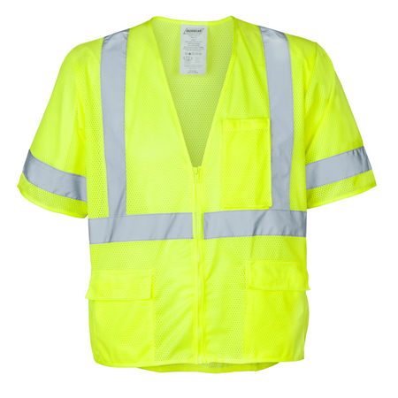 High-visibility Class 3 safety vest made from breathable lime polyester mesh fabric with matching lime binding. Features 2” silver reflective tape in a suspender pattern over the shoulders and 360° continuous reflective bands for enhanced visibility. Designed with a secure zipper front closure and five functional pockets for storage.