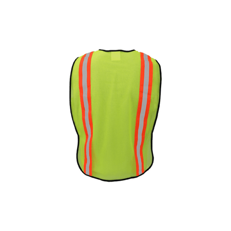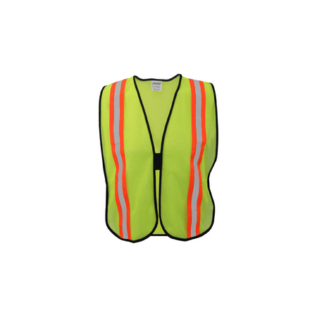 This high-visibility safety vest is designed for basic protection and visibility in various work environments. Constructed from 100% polyester mesh fabric in lime, it ensures lightweight comfort and breathability. The black polyester binding adds durability, while the 1/2-inch silver reflective tape on 2-inch orange fabric enhances visibility, making it easier to be seen in low-light conditions.
