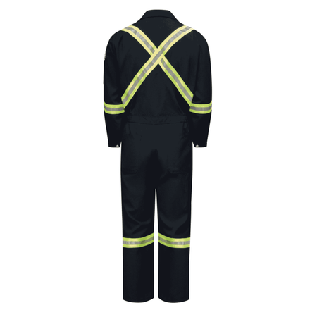 Stay protected and visible with these navy enhanced visibility flame resistant coveralls made from midweight Nomex® IIIA fabric. Designed to deliver CAT 2 FR/AR protection, these premium coveralls feature 2-inch reflective striping for 360° visibility in low-light or hazardous environments. Built for serious job site conditions, the garment includes a two-way concealed Nomex® taped brass zipper, deep-pleated action back, and elastic waist inserts for maximum mobility and comfort. Eight pockets, side vent openings, and durable construction make these coveralls as functional as they are protective.