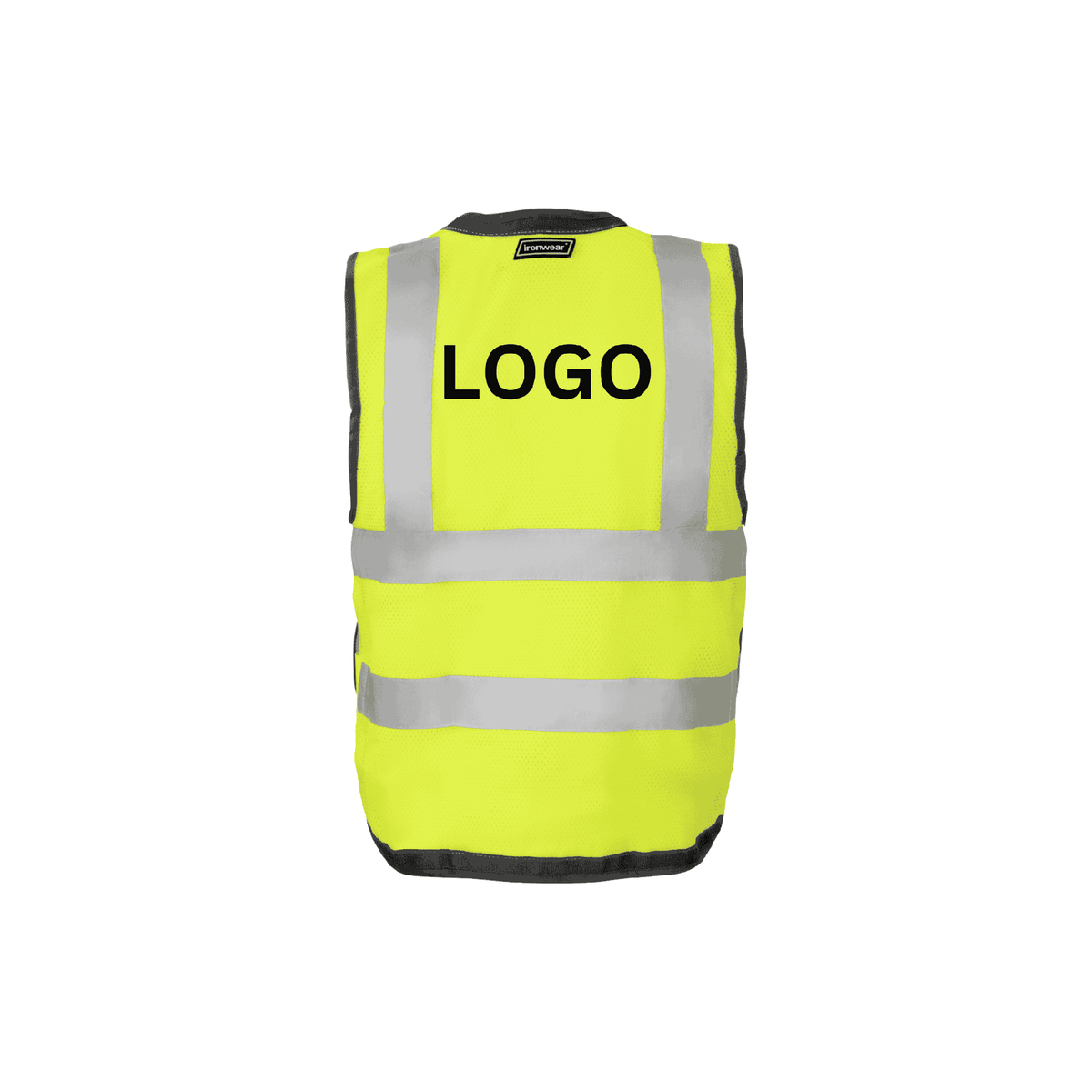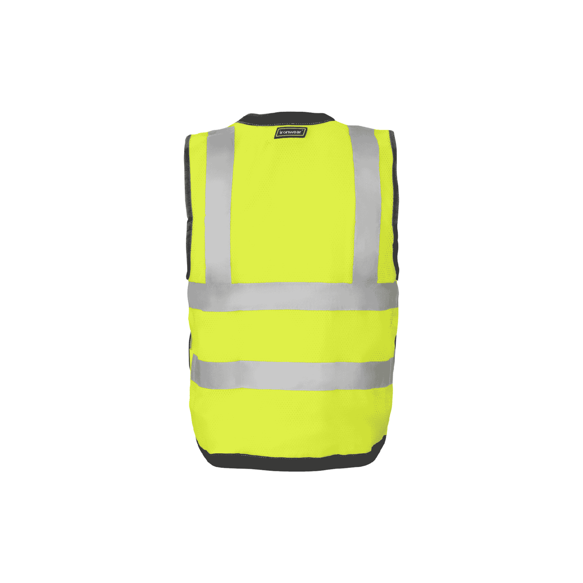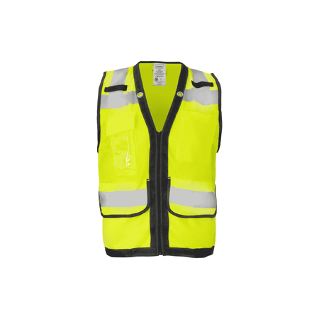 Lime polyester mesh fabric with black binding, 2” silver reflective tape, and zipper front closure. Meets ANSI/ISEA 107-2015 Class 2 standards. Features 8 pockets, 2 grommet holes, and a back tablet pass-through pocket.