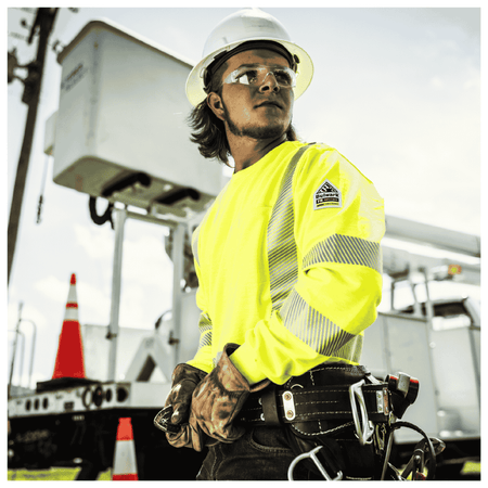 Stay safe, cool, and visible from jobsite to downtime with this Men's Lightweight FR Hi-Visibility Long Sleeve T-Shirt. Built for versatility, this flame-resistant shirt features a breathable 6.7 oz. modacrylic blend that wicks moisture and delivers lightweight comfort—even on the hottest days. Designed for ANSI 107-2020 Type R, Class 3 compliance, it includes 360° visibility with 2-inch heat-sealed reflective striping on the front and back. Certified to meet NFPA® 2112 and NFPA® 2113 standards, this CAT 2 shirt offers an arc rating of 8.3 cal/cm², making it ideal for arc flash and flash fire protection.