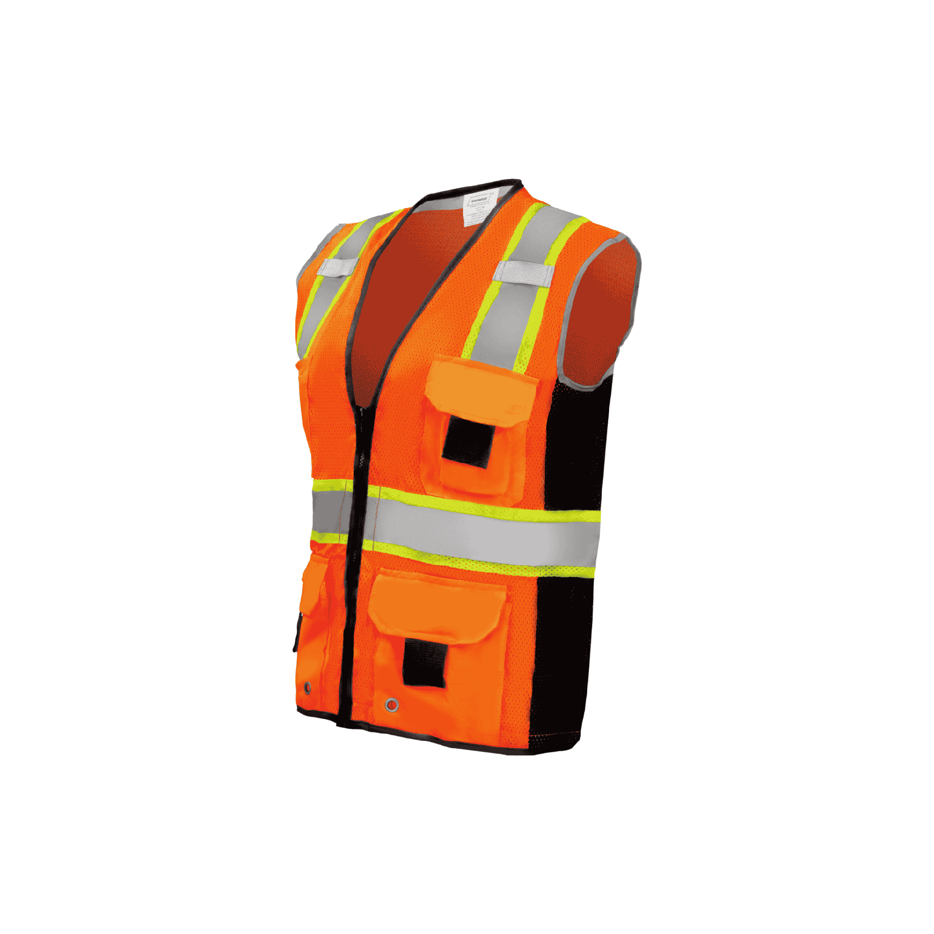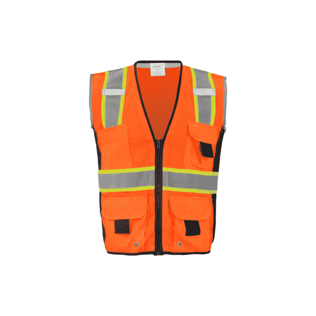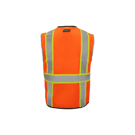 This high-visibility safety vest is constructed from 100% polyester mesh fabric in hi-vis orange, providing excellent breathability and durability. It features 2-inch silver reflective tape over 3-inch hi-vis lime mesh fabric, strategically placed to enhance visibility by extending over the shoulders, around the torso, and forming an H-pattern across the back. The vest is designed with hi-vis silver reflective and black polyester binding, adding contrast and a professional look.