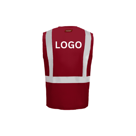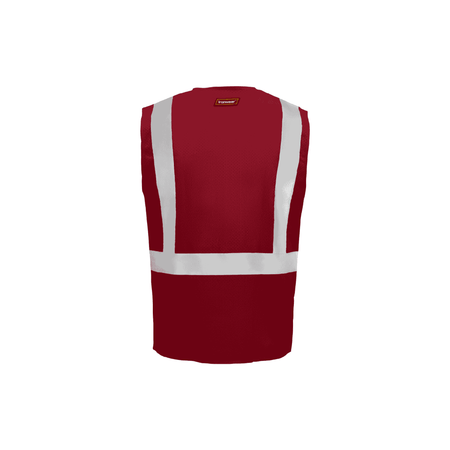 This safety vest is expertly constructed from 100% polyester mesh fabric, ensuring both breathability and durability for everyday use. It features two radio clip holders for convenient access to communication devices and high-visibility 2-inch silver reflective tape that wraps over the shoulders and around the torso, providing superior recognition in low-light conditions. Finished with red polyester binding, the vest boasts a vibrant red color and is designed as an Economy class garment. It secures with a reliable zipper front closure and offers practical storage with five well-positioned pockets.