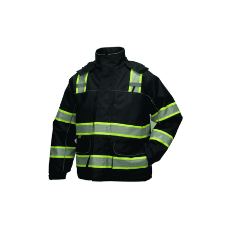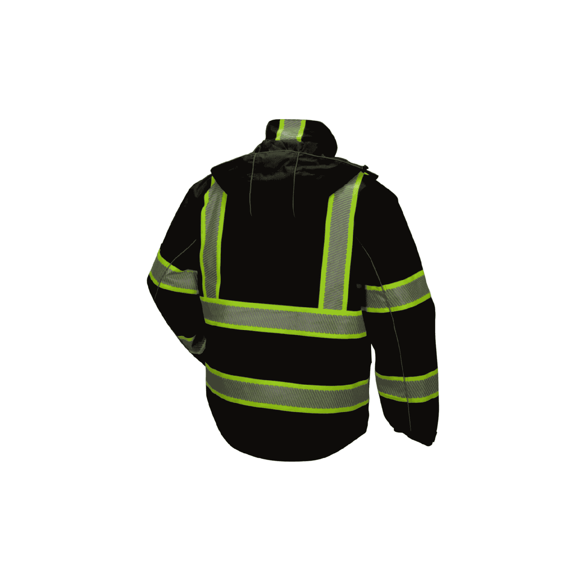Durable, waterproof ANSI Type O Class 1 parka with Teflon®-treated rip-stop polyester shell. Features segmented silver reflective material, quilted interior, detachable hood, and multiple pockets for functionality.